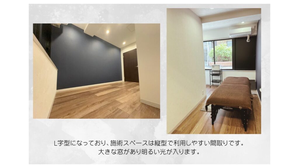 ベッド一台の周りを施術で1周するには十分な広さがあり、奥に収納・マシン等の設置にも使用できるスペースがあるL字型のお部屋となっています。