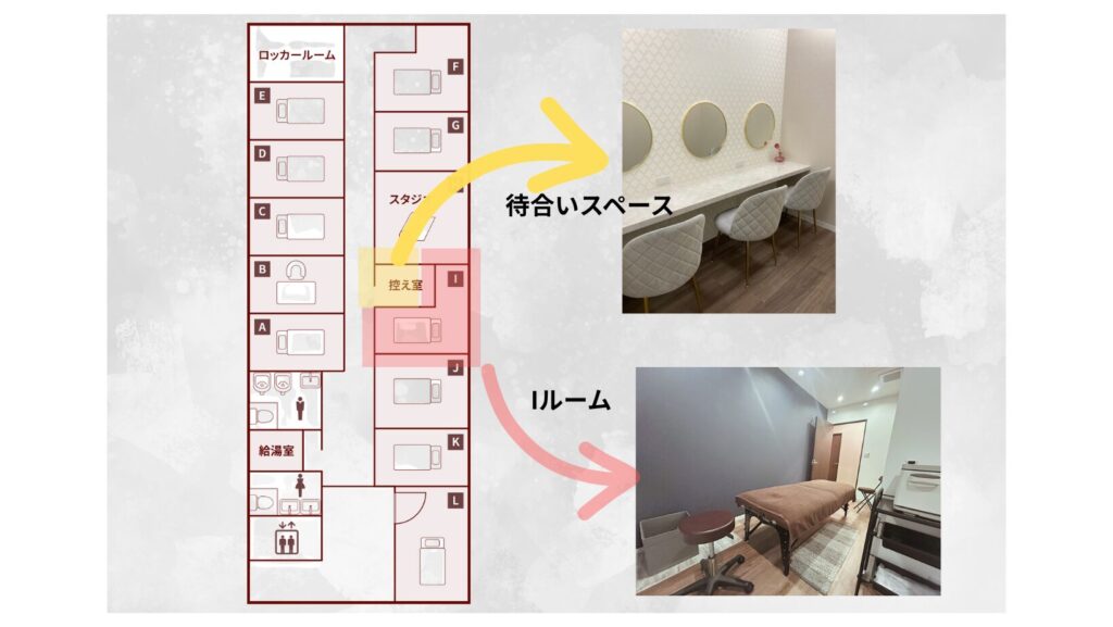 BEAUTY SHARE SALON恵比寿店内には、個室が11室+スタジオルームが1室、それに共有でご利用いただける待合いスペースとロッカールームがあります。